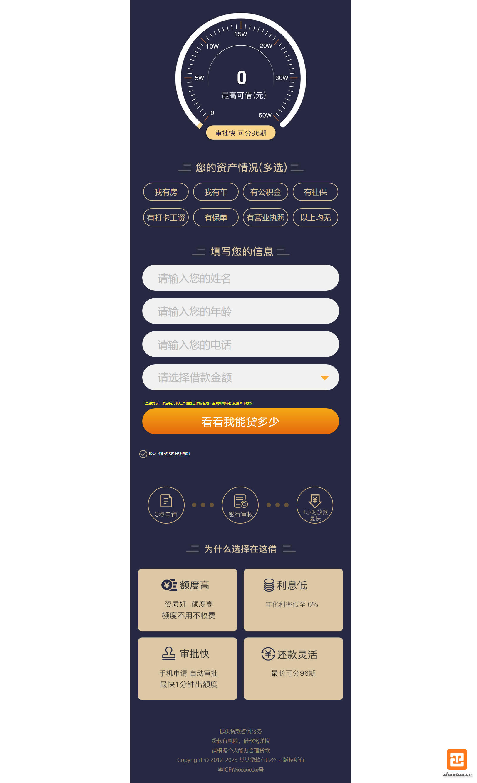 該模板屬于金融貸款類(lèi)落地推廣頁(yè)類(lèi)型,適合我們做簡(jiǎn)單的競(jìng)價(jià)推廣頁(yè)面,簡(jiǎn)潔簡(jiǎn)單,容易獲客,沒(méi)有繁雜的流程,可以在PC端、移動(dòng)端、微信端等均可使用來(lái)做推廣。